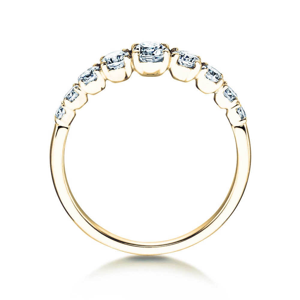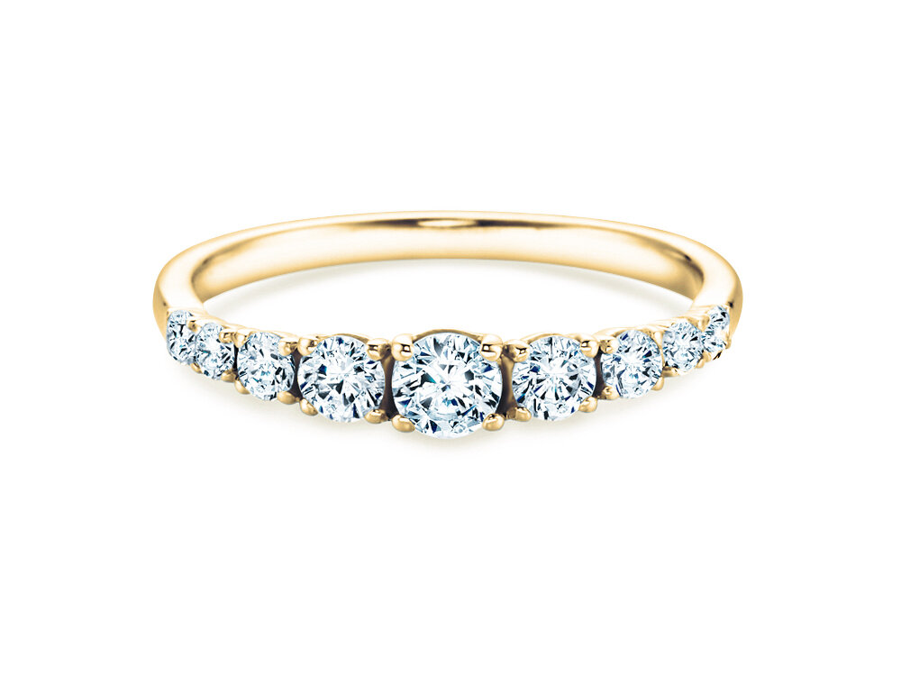 El modelo 9 Diamonds, muy equilibrado y elegante, está engastado con nueve diamantes de diferentes tamaños, que aumentan de tamaño hacia el centro superior del riel del anillo. Una obra de arte en cada mano, fácil de combinar con otras joyas, siempre moderna y atemporal.