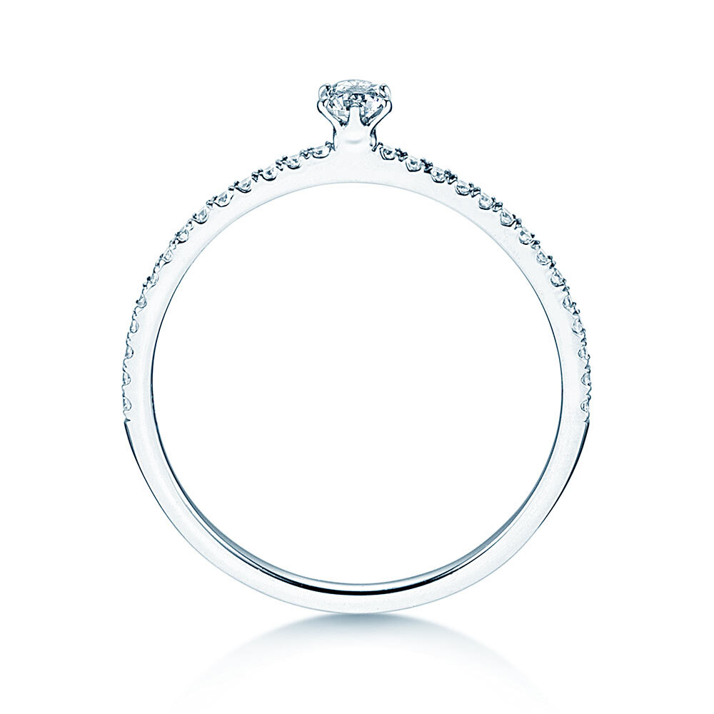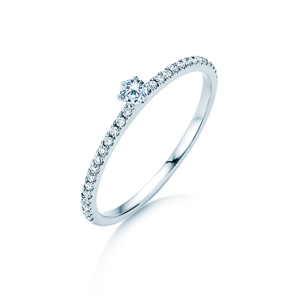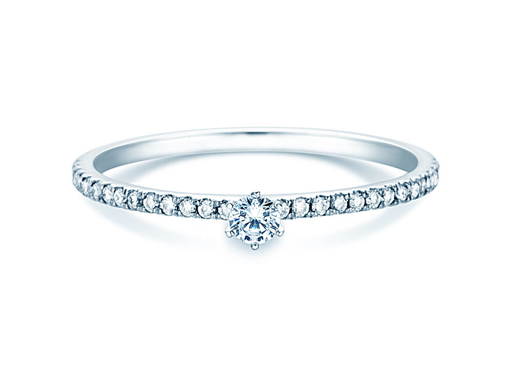 El engaste con diamantes a lo largo del raíl, conocido como pavé, da un aspecto sumamente elegante a este anillo de compromiso. El anillo solitario Classic con pavé de oro blanco es uno de nuestros modelos más populares, por lo que le ofrecemos esta obra maestra - apta para todos los bolsillos - con tres tamaños de brillante diferentes.