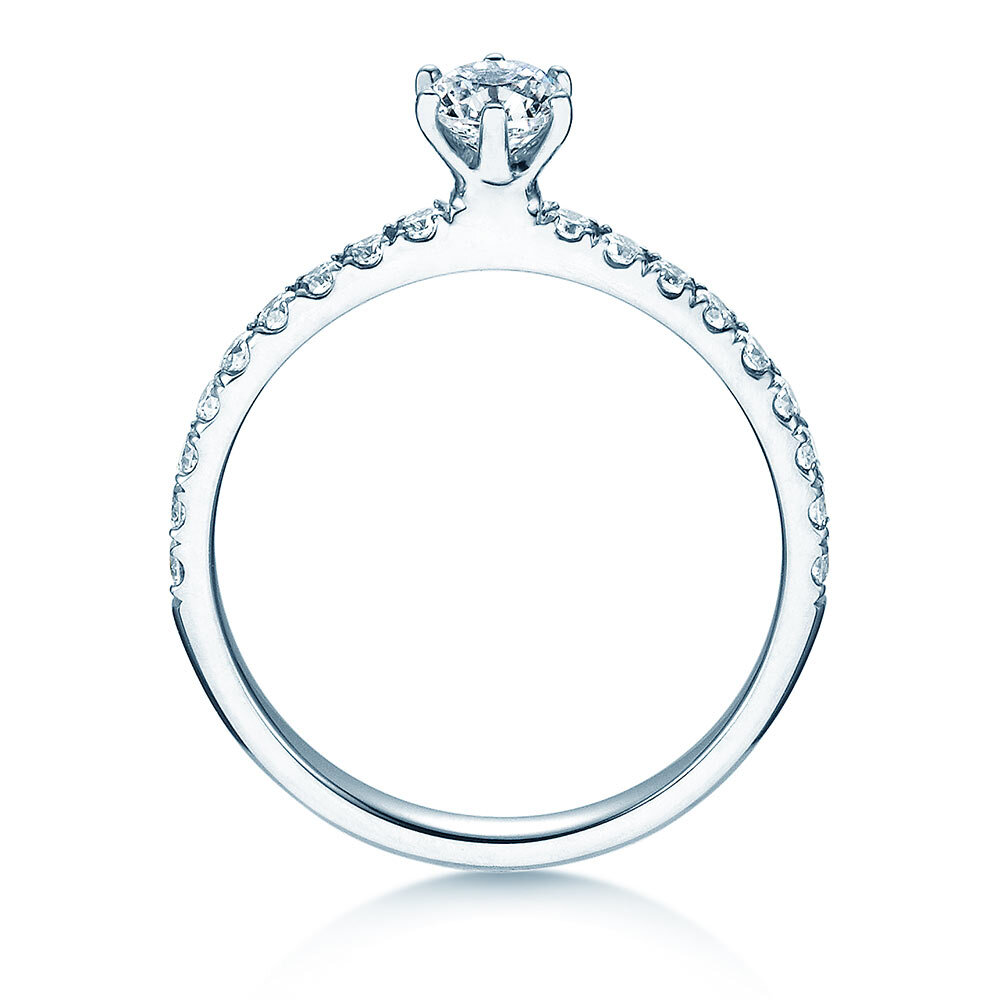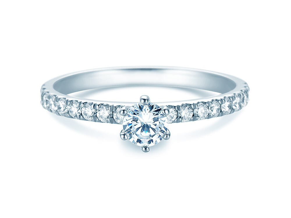 El engaste con diamantes a lo largo del raíl, conocido como pavé, da un aspecto sumamente elegante a este anillo de compromiso. El anillo solitario Classic con pavé de oro blanco es uno de nuestros modelos más populares, por lo que le ofrecemos esta obra maestra - apta para todos los bolsillos - con tres tamaños de brillante diferentes.
