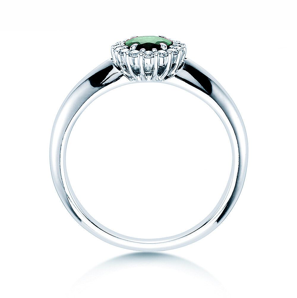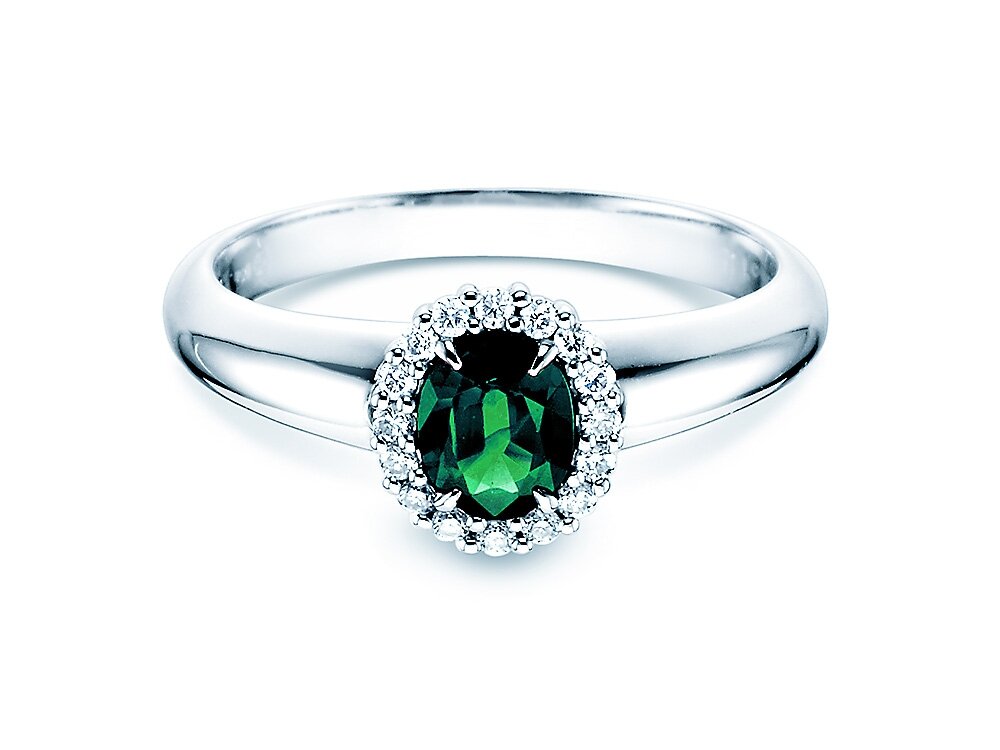 Este maravilloso anillo de platino con una corona de 16 diamantes resplandecientes y una esmeralda ovalada tiene un look majestuoso. La esmeralda pertenece a la familia del berilio y ya era considerada un símbolo de poder por los faraones egipcios. Con su brillante color verde, simboliza la calma, la relajación y la alegría de vivir. Regale un clásico moderno del arte orfebre con el precioso modelo Windsor.
