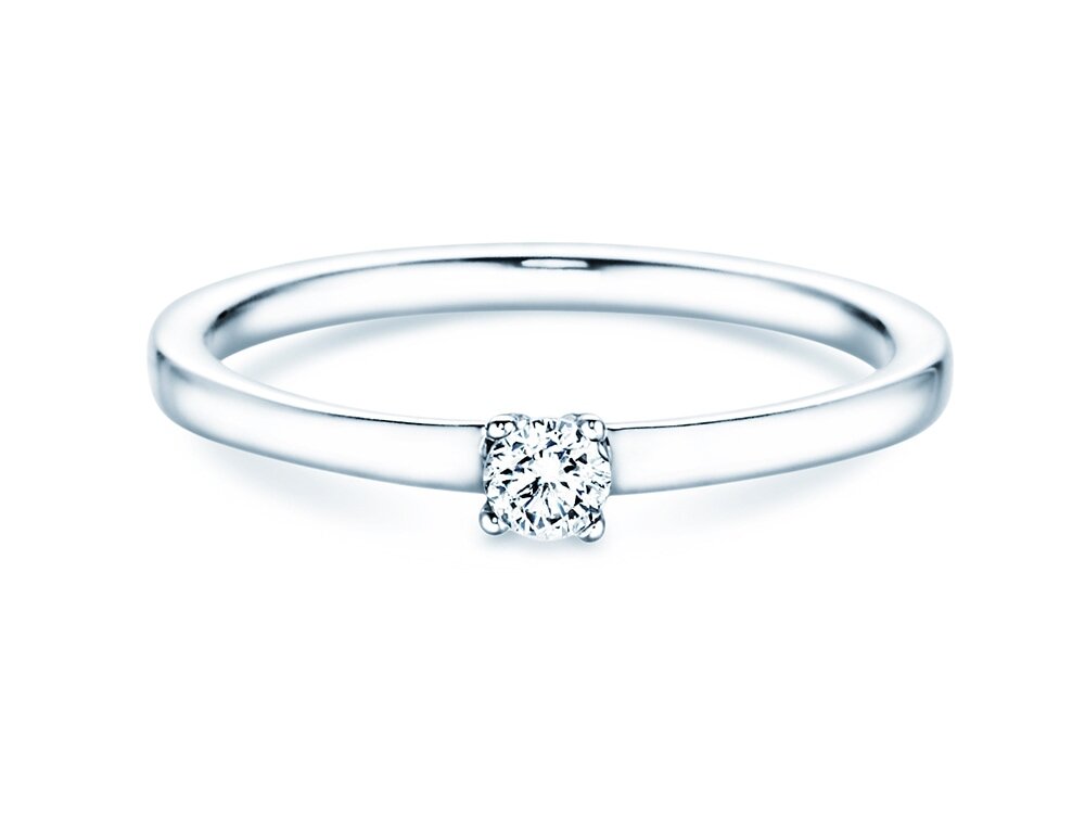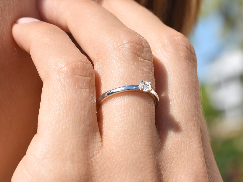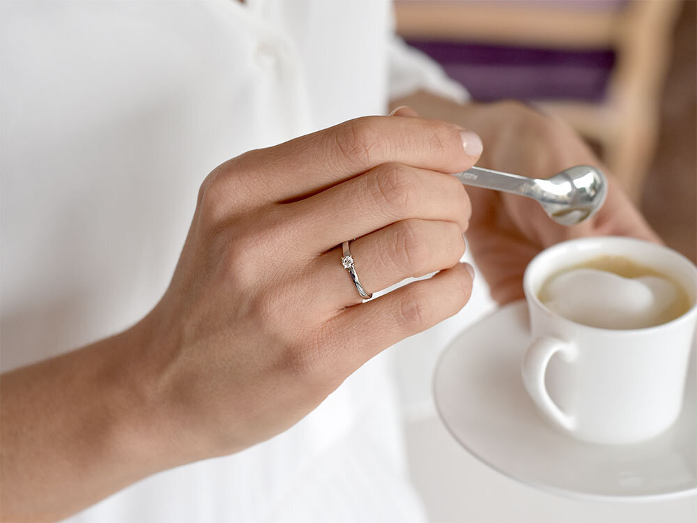 El anillo de compromiso Modern Petite es la entrada ideal en el mundo de las joyas clásicas. El diamante es engazado por una montura noble de 4 garras.