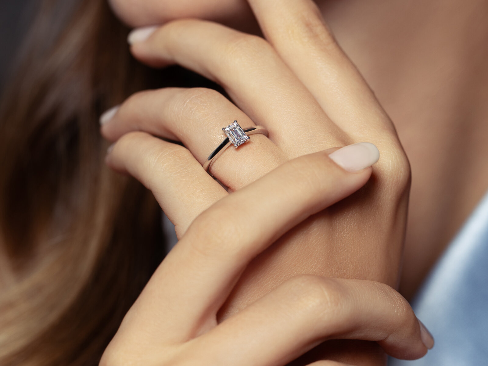 Con su sencilla estructura, el anillo de compromiso Emerald Cross desprende una elegancia lineal.